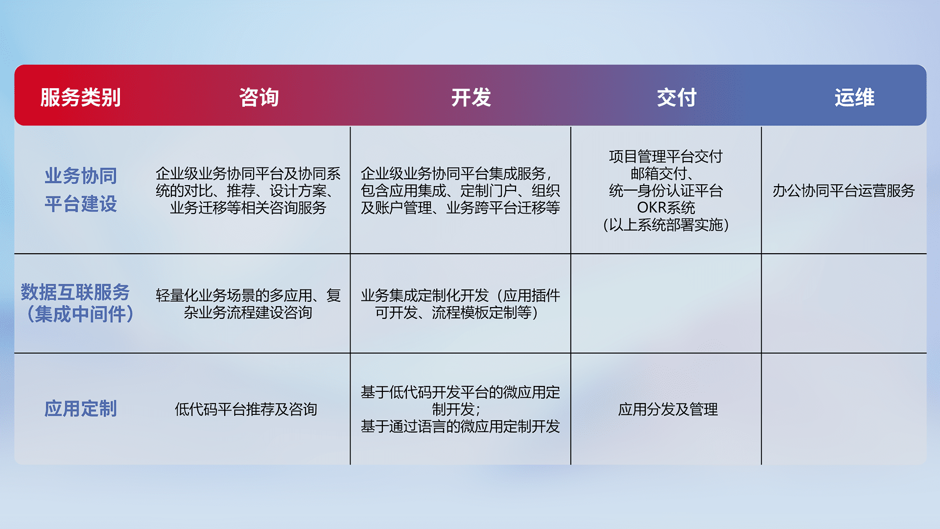 针对钉钉、、企微、、、、IDaas等平台级产品提供产品的规划、、、方案、、、、交付、、、、定制化开发等服务,,,实现如统一协同办公、、、、智能客户服务、、、混合会议管理、、、、智能数据查询、、、等业务场景,,,,实现数字化转型。。。。