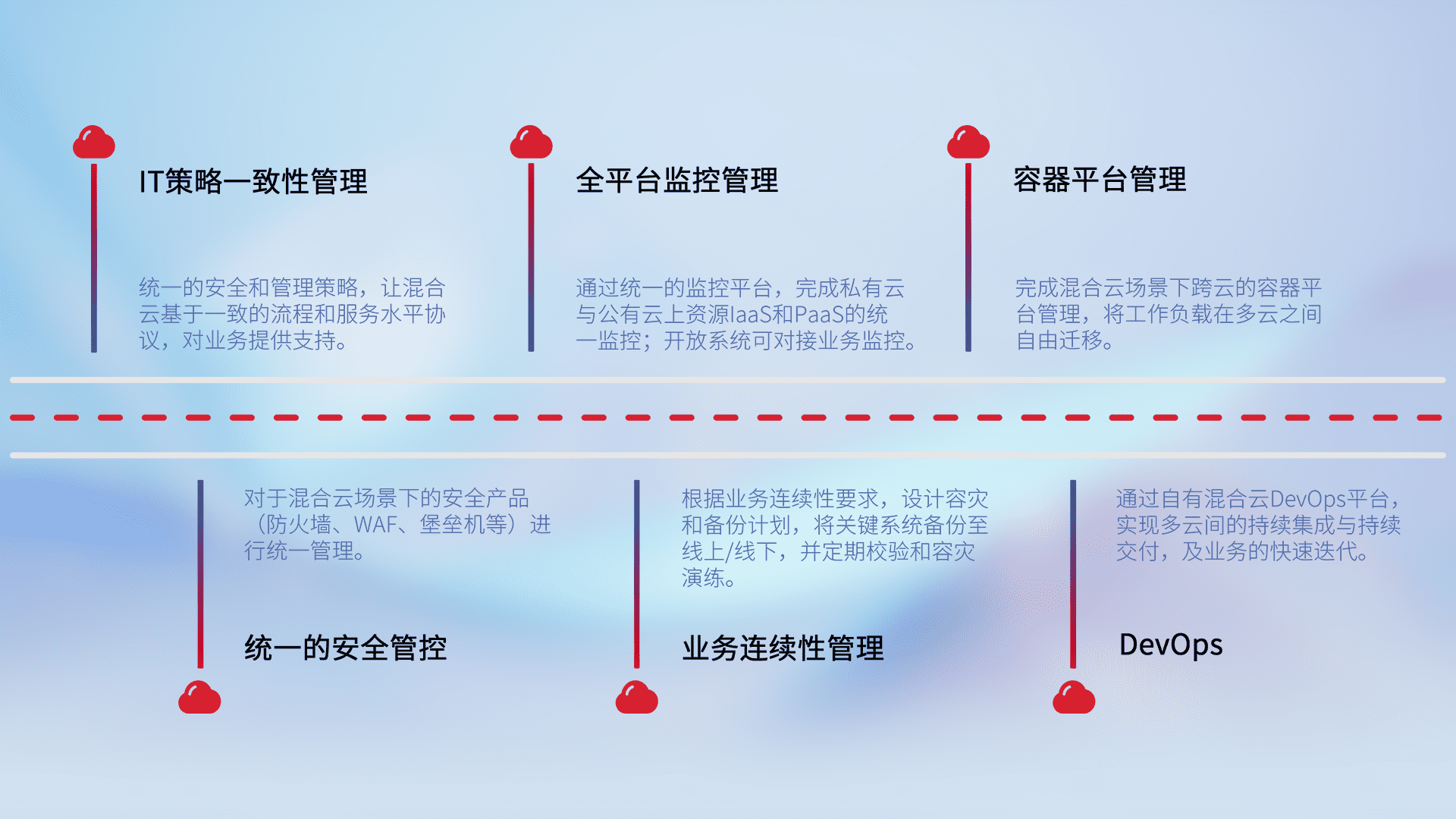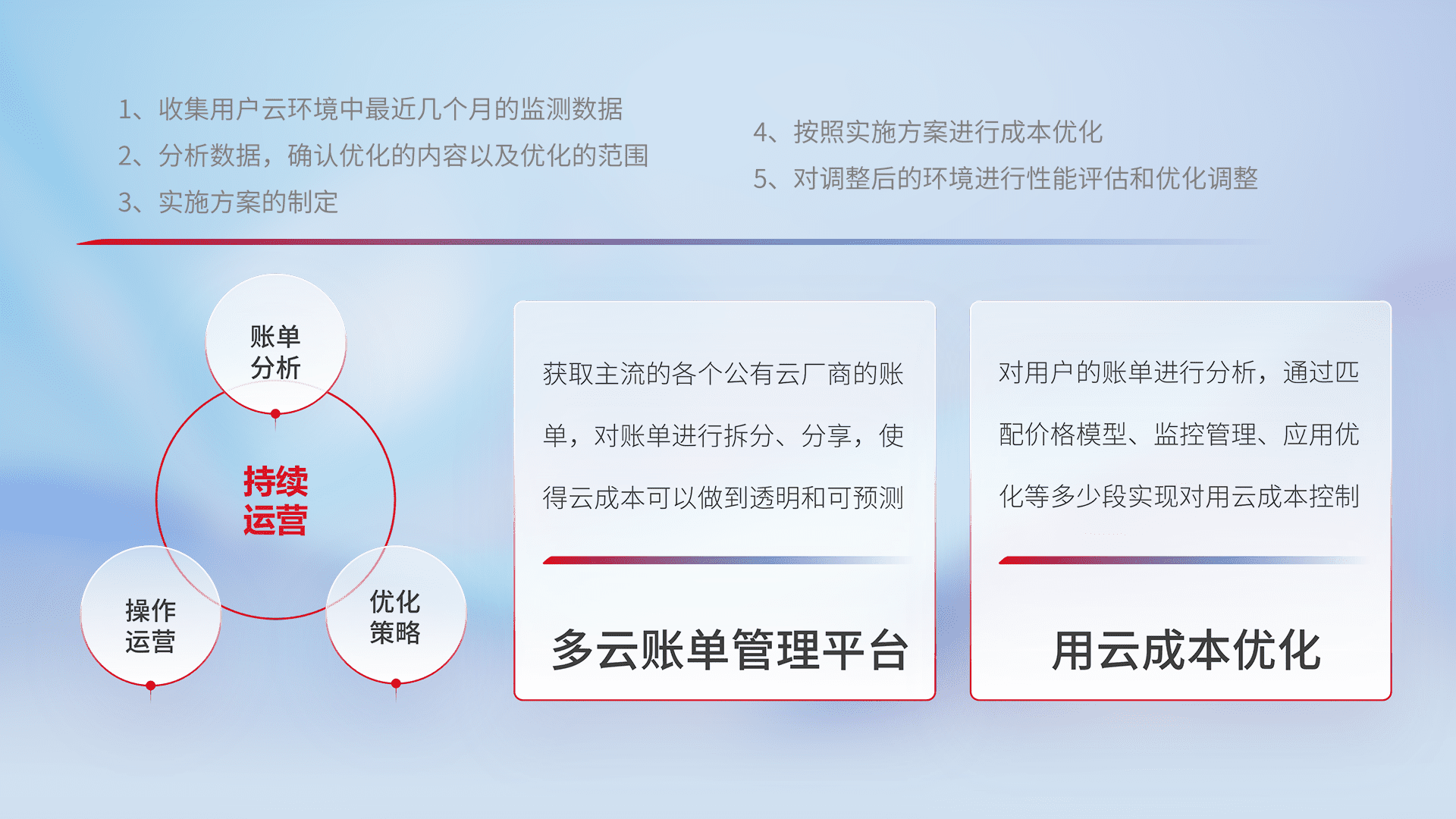 通过多云纳管,,,以统一的资源数据模型把客户的云资源进行抽象和封装,,进而实现对多云资源的统一操作,,,,保障云资源管理的可靠性、、稳定性与可用性。。量身定制化运维内容,,配置、、开发运维、、、补丁管理、、、、备份、、监控、、、、认证和访问管理、、审计和日常巡检等,,保障在用云过程中的可靠度,,稳定度以及高可用率。。。。